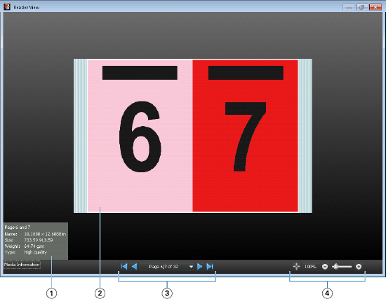 1 표시된 페이지의 용지 정보 2 표시된 문서의 페이지 3 탐색 컨트롤 4 확대/축소 컨트롤