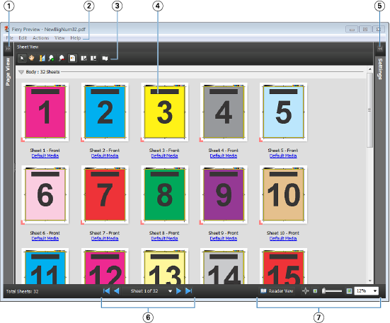 아래 그림은 표준 "미리 보기" 창을 보여줍니다. 미리 보기를 처음으로 열 때 "페이지 보기" 및 "설정" 창을 숨겨져 있는 경우, 도구 모음의 왼쪽과 오른쪽에 있는 화살표를 각각 클릭합니다.
