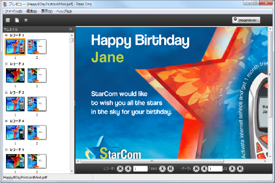 面付け前の処理済みVDPジョブが「Raster Preview」ウィンドウに表示されているときは、レコードとページによるナビゲートができます。またFieryサーバーでサポートされている場合は「ImageViewer」ウィンドウでそのジョブを開くこともできます。