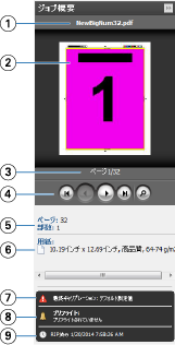 「ジョブ概要」ペインには、選択した処理済みジョブに関する特定の情報と、そのジョブの全ページのサムネイルが表示されます。このペインの上部には、選択したジョブのファイル名、その下にジョブの全ページのサムネイルが表示されます(処理済み/待機ジョブの場合)。
