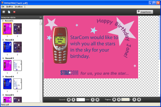 Quando un lavoro VDP elaborato viene visualizzato prima dell’imposizione nella finestra Anteprima, è possibile navigare per record e pagine. È possibile anche aprire il lavoro in Fiery ImageViewer, se il Fiery Server lo consente.