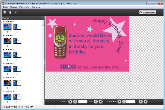 Когда перед спуском полос обработанное задание VDP отображается в окне Предварительный просмотр, можно перемещаться по записям и страницам. Можно также открыть задание в окне Fiery ImageViewer, если эта программа поддерживается сервером Fiery Server.