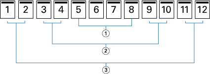 下图显示如何将一个 12 页的鞍式装订小册子的书帖折叠成为组: