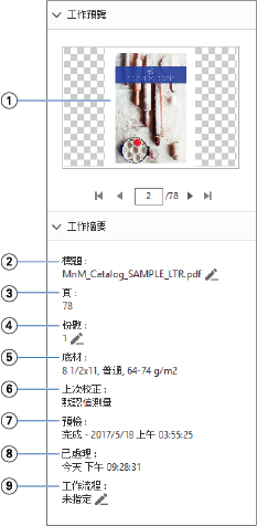 工作預覽窗格會列出所選工作的詳細資訊。如果該工作已經處理完成,則會顯示該工作所有表面的縮圖。