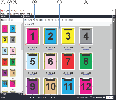 | 3 | 整頁模式中的縮圖 | 請參閱 Fiery JobMaster-Fiery Impose-Fiery Compose 說明的「開啟和檢視 Fiery Compose 的工作」。 |