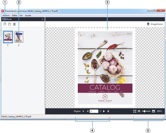 | 5 | Iconos de control de zoom para Ajustar a página y Relación de zoom |