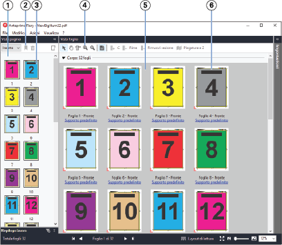 | 6 | Anteprime ridotte in Vista foglio | Vedere "Impostare la Vista foglio in anteprime ridotte o pagine intere in Fiery Compose" e "Regolare le dimensioni delle anteprime ridotte" nella Guida di Fiery JobMaster-Fiery Impose-Fiery Compose. |