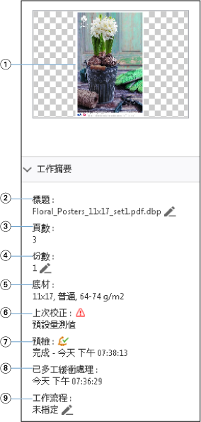 工作預覽窗格會列出所選工作的詳細資訊。如果該工作已經處理完成,則會顯示該工作所有表面的縮圖。在 FS300 Pro 或更高版本的 Fieryサーバー 上,已多工緩衝處理的工作以及已處理工作的縮略圖也將顯示。