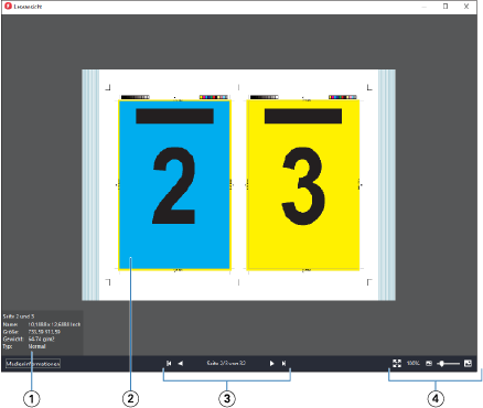 1 Medieninformation über die angezeigten Seiten 2 Seiten des angezeigten Dokuments 3 Steuerelemente zum Navigieren 4 Steuerelemente zum Zoomen