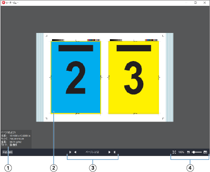 1 表示されたページに関する用紙情報 2 表示された書類のページ 3 ナビゲーションツール 4 拡大表示コントロール