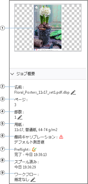ジョブプレビューペインには、選択したジョブの情報が表示されます。ジョブが処理済みである場合、ジョブ内のすべての面のサムネイルが表示されます。FS300 Pro以降のFiery serverでは、スプール済みジョブや処理済みジョブのサムネイルが表示されます。