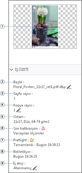 İş Önizleme bölmesi seçilen iş için belirli bilgileri listeler. İş işlendiyse, işteki tüm yüzeylerin küçük resimleri görüntülenir. FS300 Pro veya sonraki sürümlerde olan bir Fiery server için küçük resimler, bekletilen işler için olduğu gibi işlenen işler için de görüntülenir.
