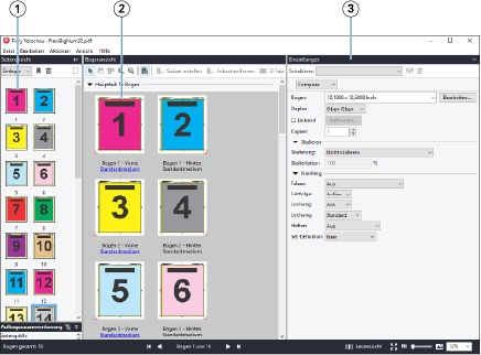 | 1 | Miniaturen im Bereich Seitenansicht | Siehe „Öffnen und Anzeigen von Aufträgen“ in der Fiery JobMaster-Fiery Impose-Fiery Compose-Hilfe. |