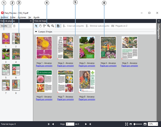 | 6 | Miniaturas en la Vista de hojas | Consulte “Definir la Vista de hojas en miniatura o páginas completas en Fiery Compose” y “Ajustar tamaño de miniatura” en Ayuda de Fiery JobMaster-Fiery Impose-Fiery Compose. |