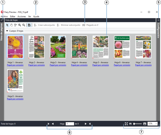 | 3 | Iconos de la barra de herramientas | Consulte Iconos de la barra de herramientas Fiery Preview. |