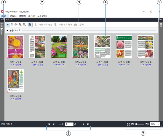 아래 그림에는 표준 Fiery 미리 보기 창이 나와 있습니다. 이 창을 처음 열 때 페이지 보기 및 설정 창이 숨겨져 있으면 도구 모음 왼쪽과 오른쪽의 화살표를 각각 클릭합니다.