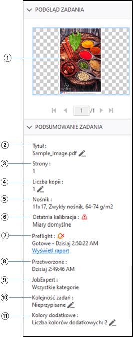 | 7 | Informacje o Preflight Ikona wskazuje stan. Błędy i ostrzeżenia zadania można wyświetlić, klikając Wyświetl raport. |