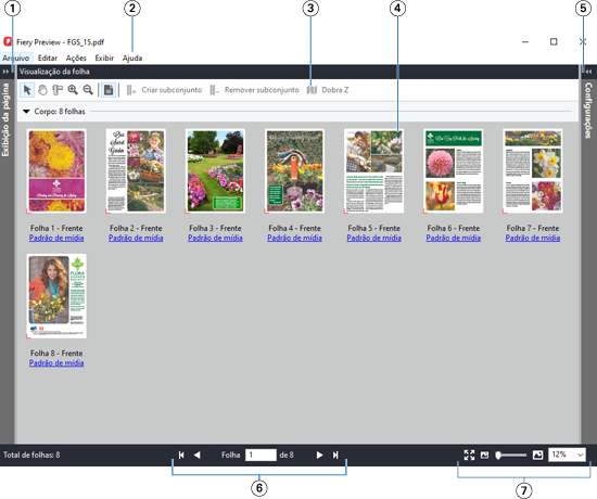 | 4 | Miniaturas na Visualização da folha | Consulte “Abrir e visualizar tarefas no Fiery Compose” na Ajuda do Fiery JobMaster-Fiery Impose-Fiery Compose. |