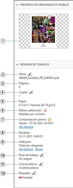 El panel Presentación preliminar de trabajo muestra información específica del trabajo seleccionado. Si se ha procesado el trabajo, aparecen las miniaturas de todas las superficies que hay en este. En un Fiery server que sea FS300 Pro o posterior, se muestran miniaturas para los trabajos en cola, así como los trabajos procesados.