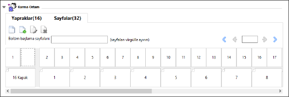 İkinci sıra yaprakların yazıcıda hangi sırayla dizileceğini gösterir. Bu örnekte belgenin ilk iki sayfasına karşılık gelen ön kapak içeriği, başlangıçta okuma sırasına göre görüntülenir. İşin sonundaki arka kapak içeriği kaydırma çubuğu veya diğer gezinti kontrolleri kullanılarak görüntülenebilir.
