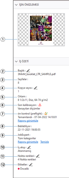 İşin önizlemesi bölmesi seçilen işle ilgili belirli bilgileri listeler. İş işlendiyse, işteki tüm yüzeylerin küçük resimleri görüntülenir. FS300 Pro veya sonraki sürümlerde olan bir Fiery server için küçük resimler, bekletilen işler için olduğu gibi işlenen işler için de görüntülenir.