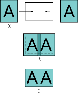 次の図は、書類サイズが用紙の1/2のサイズより大きくて用紙に合わせて縮小オフになっている場合、ページ配置をセンターにしたときのページ配置を示しています。
