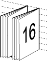 次の図は、複合中とじ、左とじで16ページの書類を面付けしてとじる場合を示しています。各サブセットには2枚のシート(シートごとに8ページの書類ページ)が含まれます。