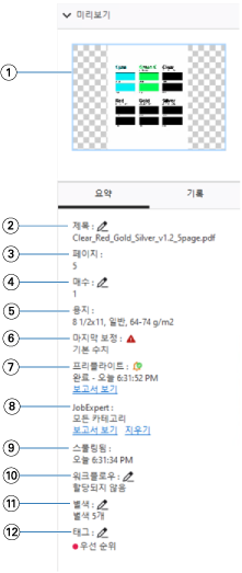 작업 요약 창에는 선택한 작업에 대한 특정 정보가 나열됩니다. 작업이 처리된 경우 해당 작업 내 모든 표면의 축소 그림이 표시됩니다. Fiery 시스템 소프트웨어 FS300/300 Pro이상이 설치되어 있는 Fiery server에서는 스풀링된 작업과 처리된 작업에 대해 축소 이미지가 표시됩니다.