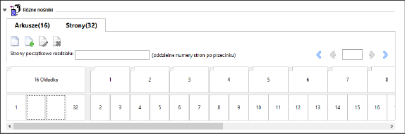 Miniatury w górnym rzędzie odzwierciedlają rzeczywisty porządek drukowania w drukarce. W drugim rzędzie prezentowany jest układ stron na arkuszach. W przykładzie przedstawionym na poniższej ilustracji arkusz okładki obejmuje zawartość pierwszych dwóch stron dokumentu jako okładkę przednią, zawartość trzeciej strony od końca jako grzbiet i zawartość dwóch ostatnich stron dokumentu jako okładkę tylną.