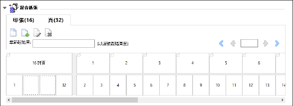 在頂行的縮圖顯示印表機實際的列印順序。第二行顯示在印張上列印的頁面。如下圖所示,封面印張包含作為封面的文件前兩頁的內容、作為書脊的倒數第三頁的內容,以及作為封底的最後兩頁的內容。