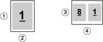 Par exemple, si votre document est au format 8,5 x 11 pouces et que vous sélectionnez 8,5 x 11 pouces dans le menu Format papier pour l’imposition 2 poses, les dimensions des pages du document sont réduites de façon à tenir sur deux pages de 5,5 x 8,5 pouces en vis-à-vis. Le format de document (entrée) est présenté à gauche, et le format papier (sortie) à droite dans l’illustration ci-dessous :