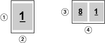 たとえば、書類サイズが8.5x11インチの印刷ジョブに用紙サイズメニューで8.5x11インチを選択し、2-up面付けを指定した場合、書類ページは5.5x8.5インチに縮小され、用紙に2ページずつ並列して印刷されます。下の図は、左側に書類サイズ(入力)、右側に用紙サイズ(出力)を示しています。