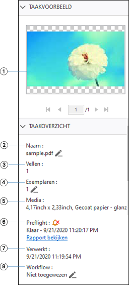 Opmerking: Een in de wachtrij geplaatste, niet-verwerkte taak kan in het venster Fiery-voorbeeld worden weergegeven.