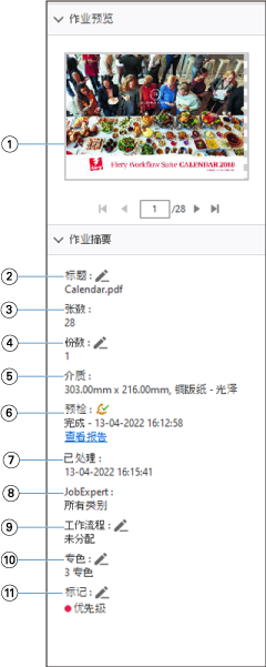 启动 Command WorkStation 并在保留列表中选择一个已处理作业,以在作业预览窗格中显示。作业相关信息将显示。有些类型的信息可编辑。