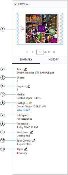 The Job Summary pane is at the right side of the Command WorkStation window. If the job is processed, tools are provided for navigating through the document. The following illustration shows a processed job.