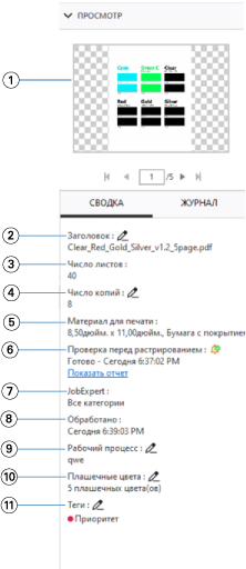 Запустите Command WorkStation и в списке Задержанные выберите обработанное задание, чтобы отобразить его на панели Предварительный просмотр. Будет показана информация о задании. Некоторые категории информации можно редактировать.