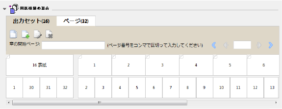 一番上の段のサムネイルは、プリンター複写機/プリンター上での実際の印刷順序を表します。次の段には、どのページがどのシートに印刷されるかが表示されます。たとえば、以下の図の表紙のシートには、おもて表紙(書類の最初の2ページの内容)、背表紙(最後から3ページ目の内容)、裏表紙(書類の最後の2ページの内容)が含まれています。