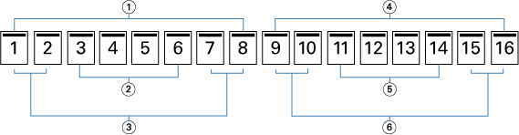 次の図は、複合中とじ、左とじで16ページの書類を面付けしてとじる場合を示しています。各サブセットには2枚のシート(シートごとに8ページの書類ページ)が含まれます。