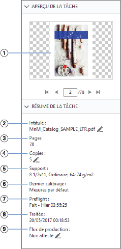 Lancez la Command WorkStation et sélectionnez une tâche spoulée ou traitée dans la liste En attente afin de l’afficher dans le volet Aperçu de la tâche. Des informations sur la tâche sont affichées. Certaines catégories d’informations peuvent être modifiées.