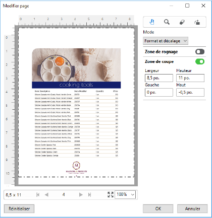 Sélectionnez Marge ou Format et décalage pour effectuer des ajustements de la Zone de rognage et/ou la Zone de coupe.
