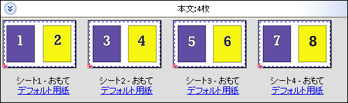 「唯一-丁合い」はシートがスタックおよびカットされたときに正しい順序になるようにページを配置します。このオプションは手で丁合いする必要を最小限にし、書類を一部印刷するときに最も適しています。