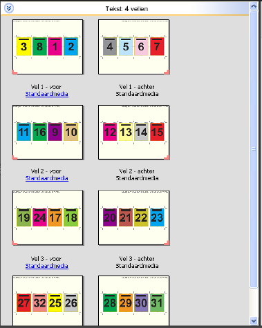 De opmaak 2 per vel; op de rug gebonden is bedoeld voor taken met veelvouden van vier pagina's, maar u kunt deze opmaak ook gebruiken voor taken met een ander aantal pagina's. In Fiery Impose worden zo nodig blanco pagina's toegevoegd. Pagina's worden geordend in groepen van vier, zodat elk vel na het vouwen vier opeenvolgende pagina's bevat.