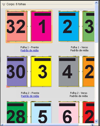 O layout 3 pág./folha – Brochura com três dobras é utilizado com tarefas que tenham seis páginas ou múltiplos de seis páginas, mas também pode ser utilizado com tarefas que tenham qualquer número de páginas. O Fiery Impose adiciona páginas em branco conforme a necessidade.