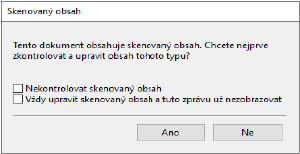 Pokud vložený dokument ve formátu PDF obsahuje skenovaný obsah a pokud je zapnuta předvolba pro kontrolu přítomnosti skenovaného obsahu, zobrazí se zpráva s dotazem, zda si chcete prohlédnout a upravit skenované obrázky. Pro úpravy budou nabídnuty pouze stránky, které obsahují naskenované obrázky. Kontrola přítomnosti skenovaného obsahu a zobrazení zprávy o skenovaném obsahu jsou však předvolby, které lze vypnout.