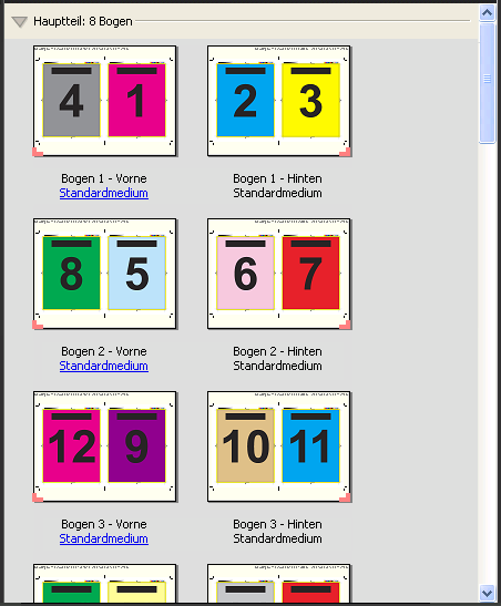 Mit dem Layout 2-fach, Rückenheftung werden Bogen für ein Buch erstellt, das am Rücken geheftet oder geklammert wird. Für die Rückenheftung werden alle Bogen ineinandergelegt und zusammengefalzt. Für dieses Layout kommen folgende Einstellungen zum Einsatz: