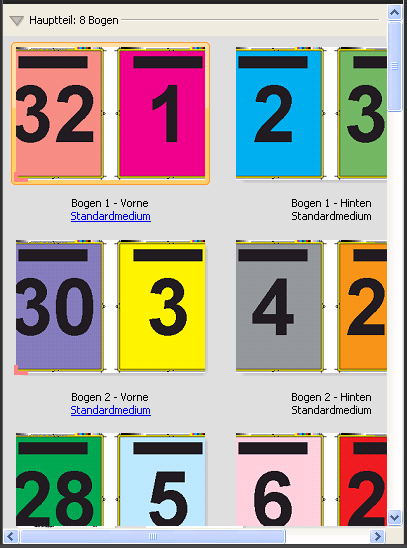 Das Layout 4-fach, Zickzackfalz ist für Auftragsdokumente konzipiert, deren Seitenanzahl ein Vielfaches von acht ist. Es kann aber auch für Dokumente mit einer abweichenden Anzahl von Seiten verwendet werden. Fiery Impose fügt bei Bedarf zusätzliche Leerseiten ein.