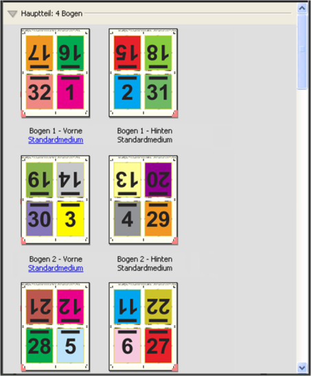 Das Layout 4-fach, Altarfalz ist für Auftragsdokumente konzipiert, deren Seitenanzahl ein Vielfaches von acht ist. Es kann aber auch für Dokumente mit einer abweichenden Anzahl von Seiten verwendet werden. Fiery Impose fügt bei Bedarf zusätzliche Leerseiten ein.