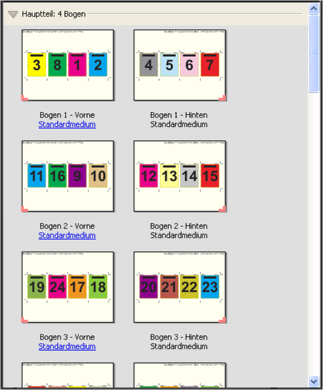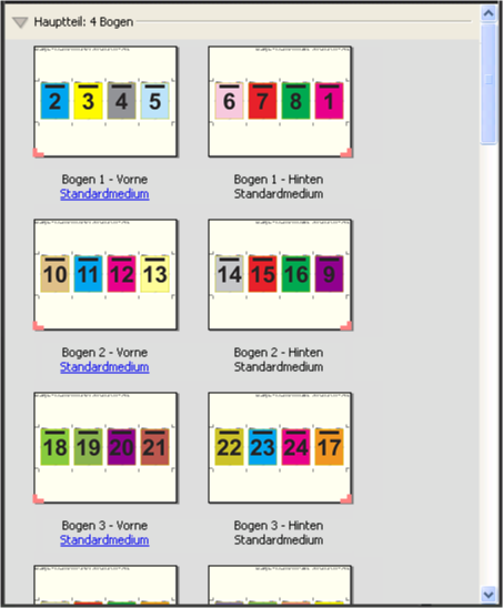 Ein mit der Schablone 4-fach, Kopf an Kopf erstellter Bogen wird in der Regel wie in der folgenden Abbildung dargestellt gefalzt. Mehrere Bogen müssen aufeinandergelegt und als Gruppe gefalzt werden.
