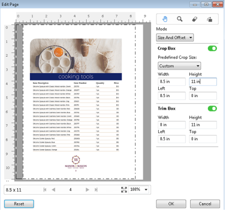 When Crop Box has been enabled, Size And Offset gives the ability to customize Crop Box by either selecting a standard sheet size or specifying the Width and Height of Crop Box. Left and Top are used to specify the distance between the left side and the top of Trim Box in relation to the Crop Box. When Trim Box has been enabled, the page's Trim Box can be customized by specifying Width and Height.