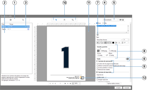 | 6 | Controles para permitir/deshabilitar un fondo para el campo número de página en el documento. |